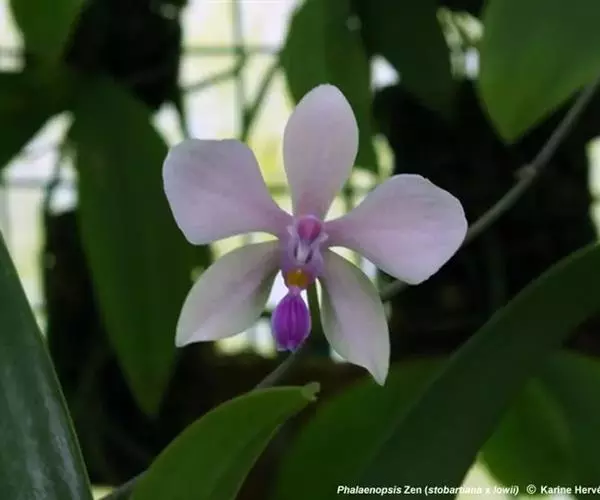 花序从茎的基部发出,常1-2个,斜立,长4-8.5厘米,不分枝,花序轴疏生2-5朵花;花序柄暗紫色,粗约2毫米,被1-2枚膜质鞘;花苞片膜质,卵状三角形,长4-5毫米,先端锐尖;花梗连同子房长3-3.8厘米;花开放,萼片和花瓣白色带淡粉红色的中肋或全体淡粉红色;中萼片长圆状椭圆形,长1.5-2厘米,宽6-7毫米,先端钝,具5条脉;侧萼片与中萼片相似而等大,但近唇瓣一侧的中部以下边缘下弯,基部贴生在蕊柱足上;花瓣匙形或椭圆状倒卵形,长1.4-1.5厘米,宽6-10毫米,先端圆形,基部楔形收狭;唇瓣基部具长2-3毫米的爪,3裂;侧裂片上半部紫色,下半部黄色,直立,狭长,长约6毫米,中部缢缩,上部扩大而先端斜截,在基部(两侧裂片之间)具1个中央对开的肉脊,其中间具穴并且向外(背面)隆起呈乳头状,内面中央的凸缘(脊突)黄色,其先端斜截并且具2至数个小缺刻;中裂片肉质,深紫色,摊平后呈宽倒卵形或倒卵状椭圆形,长8-13毫米,上部宽6-9毫米,先端钝并且稍2裂,基部具1枚紫色而先端深裂为2叉状的附属物,边缘白色、下弯而形成倒舟状,上面中央具1条纵向脊突,脊突在近唇瓣先端处强烈增厚而隆起;蕊柱淡紫色,长约6毫米,具长约3毫米的蕊柱足;药帽白色,前端稍伸长呈卵状三角形;花粉团2个,近球形,每个劈裂为不等大的2爿。