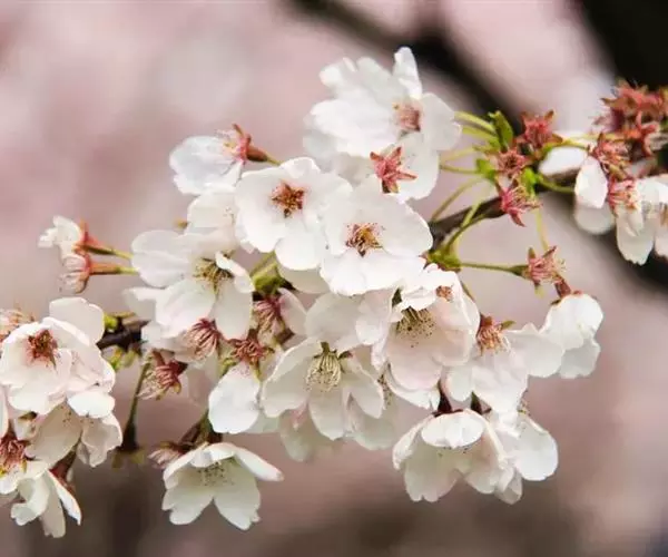 东京樱花(学名:Cerasus yedoensis (Matsum.) Yu et Li):乔木,高4-16米,树皮灰色。小枝淡紫褐色,无毛,嫩枝绿色,被疏柔毛。冬芽卵圆形,无毛。叶片椭圆卵形或倒卵形,上面深绿色,无毛,下面淡绿色,沿脉被稀疏柔毛。花序伞形总状,总梗极短,有花3-4朵,先叶开放,花直径3-3.5厘米;花瓣白色或粉红色,椭圆卵形,先端下凹,全缘二裂;雄蕊约32枚,短于花瓣;花柱基部有疏柔毛。核果近球形,直径0.7-1厘米,黑色,核表面略具棱纹。花期4月,果期5月。2n=16。