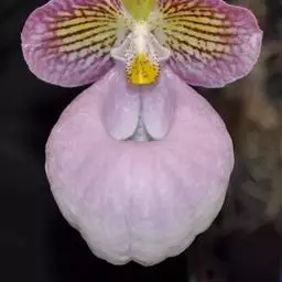 花葶直立,长17-25厘米或过之,并在果期继续延长达60厘米,紫褐色,疏被短柔毛,顶端通常生1花;花苞片2枚,大的1枚宽卵形,围抱子房,长2-2.7厘米,宽约1.4厘米,先端具3小齿,背面有龙骨状突起并被短柔毛,边缘具缘毛;小的线形,长1.4厘米,亦被毛;花梗和子房长4-5(-6)厘米,被短柔毛;花直径8-9厘米;中萼片绿白色并有绿色脉,基部常有紫晕,合萼片亦为绿白色并具深色脉,花瓣下半部有暗褐色与灰白色相间的条纹或斑及黑色斑点,上半部淡紫红色,唇瓣末端淡黄绿色至灰色,其余部分淡紫红色并有绿色的囊口边缘,退化雄蕊中央深绿色,边缘淡绿色;中萼片宽卵形,长3.5-4厘米,宽2-2.6厘米,先端短渐尖,上部边缘内卷,基部边缘外卷,背面被微柔毛并在中部以上具龙骨状突起;合萼片卵状椭圆形,长2.5-3厘米,宽1.5-1.7厘米,先端具3小齿,背面亦稍被毛;花瓣近匙形,长4.5-6厘米,上部宽1.5-2厘米,先端近急尖并略有2-3个小齿,中部至基部边缘波状并在上侧近边缘处具10余个黑色疣点,下侧边缘亦有少数黑疣点;唇瓣倒盔状,基部具宽阔的、长1.5-2厘米的柄;囊近狭椭圆形,长2-3厘米,宽1.5-1.8厘米,囊口极宽阔,两侧各具1个直立的耳,有时前侧还有2个小耳,前方边缘不内折,两侧内折裂片上常有黑色疣点,囊底有毛;退化雄蕊横椭圆形或近圆形,长6-8毫米,宽7-9毫米,先端有明显凹缺,缺口中央具短尖,基部略呈心形,上面中央有不甚明显的突起。花期1-5月。