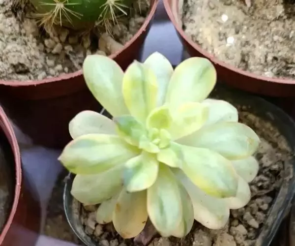 矮小灌木状植株。茎有落叶痕迹,半木质化有气生根, 叶片匙形, 颜色如同名字一样美丽,绿色的叶片中间含有黄色的锦斑。锦斑可能会消失,也可能完全锦斑化(全黄色),决定因素非常多,不可控。这是一种薄叶片的莲花掌属多肉植物,属于“冬种型” 多肉植物。圆锥花序,花黄色。