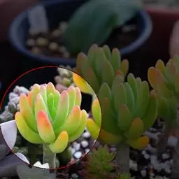 铭月在不同光照环境下会呈现出完全不同的颜色和外形。在阳光充足的环境下叶片边缘或全株呈金黄色至橘黄色,日照强烈环境下全株呈橘黄或橘红色,光照不足环境下叶片呈绿色且叶片间距拉长(徒长)。