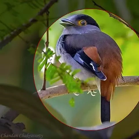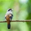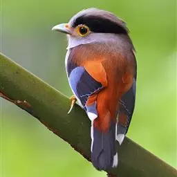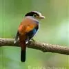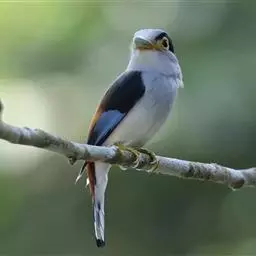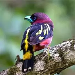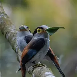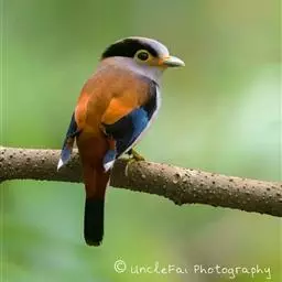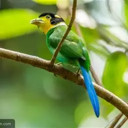 长尾阔嘴鸟是雀形目阔嘴鸟科的鸟类,体长约25厘米,是绿色阔嘴鸟。形长的楔形尾蓝色,喉及脸黄色,顶冠…