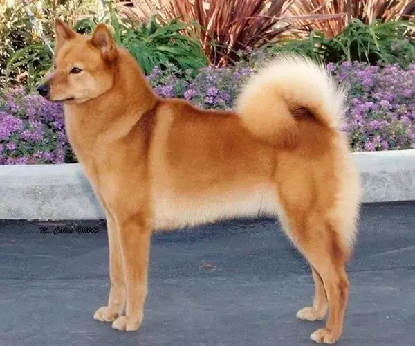 属立耳中型猎犬。嘴突出,眼黑色有神,耳直立。颈短,胸深,紧腹,肌肉发达,尾卷于背上。被毛为黄、红色,有时胸、脚部有白斑。体高40-50cm,体重23-27kg 。