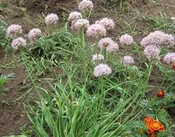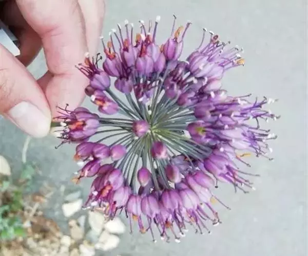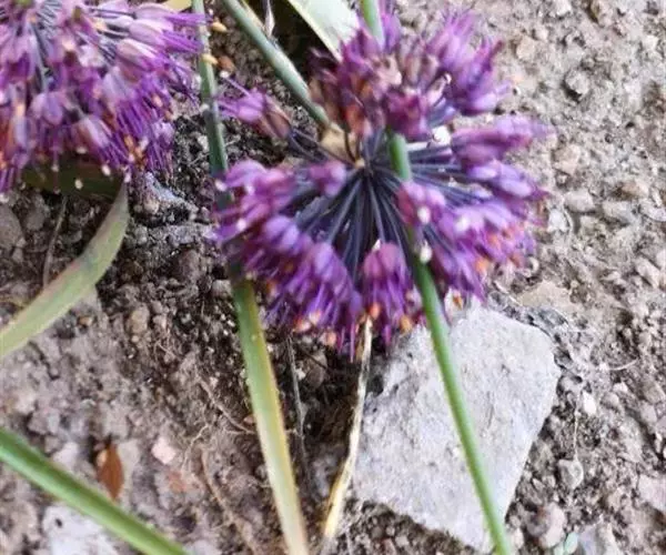 鳞茎常单生,卵状至狭卵状,或卵状柱形,粗0.7-2(-2.5)厘米;鳞茎外皮污黑色或黑褐色,纸质,顶端常破裂成纤维状,内皮有时带淡红色,膜质。叶三棱状条形,中空或基部中空,背面具1纵棱,呈龙骨状隆起,短于或略长于花葶,宽(1.5-)2-5毫米。花葶中生,圆柱状,中空,高30-70厘米,1/4-1/2被疏离的叶鞘;总苞单侧开裂或2裂,宿存;伞形花序球状,具多而极密集的花;小花梗近等长,比花被片长2-4倍,基部具小苞片;花红色至紫色;花被片椭圆形至卵状椭圆形,先端钝圆,长4-6毫米,宽2-3.5毫米,外轮舟状,较短;花丝等长,约为花被片长的1.5倍,锥形,无齿,仅基部合生并与花被片贴生;子房倒卵状球形,腹缝线基部具有帘的凹陷蜜穴;花柱伸出花被外。花果期8月底至10月。