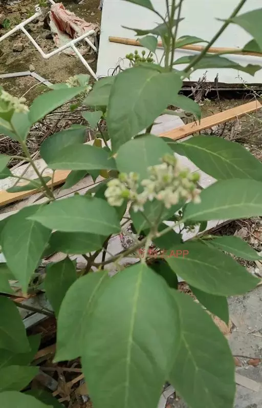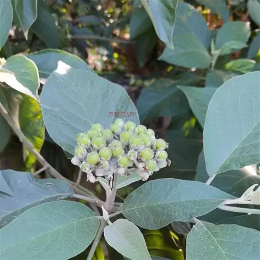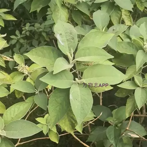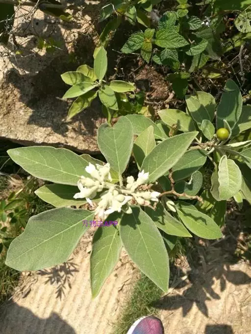 落叶灌木,高l~5m。树皮灰白色。全株均被星状柔毛,有特殊臭气。叶互生,有时对生,有柄;叶片质厚,宽卵形、矩圆状卵形或椭圆状卵形,长10~23cm,宽6~15cm,先端渐尖,基部宽楔形或近圆形,下面密被星状毛。聚伞花序项生或近顶生,总花梗上面有2分枝,每枝有一密集聚伞花序;花萼灰绿色,长约5mm;花冠浅钟状,白色,直径约1.3cm,外面被毛。浆果球形,淡黄绿色,基部有宿萼;种子多数,细小,扁圆形,白色。花期夏、秋季,果期冬季。