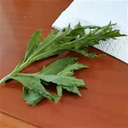 本品多皱缩、破碎,有短柄。完整叶片展平后呈卵状椭圆形,羽状深裂,裂片椭圆状披针形,边缘有不规则的粗锯齿;上表面灰绿色或深黄绿色,有稀疏的柔毛和腺点;下表面密生灰白色绒毛。质柔软。气清香,味苦。