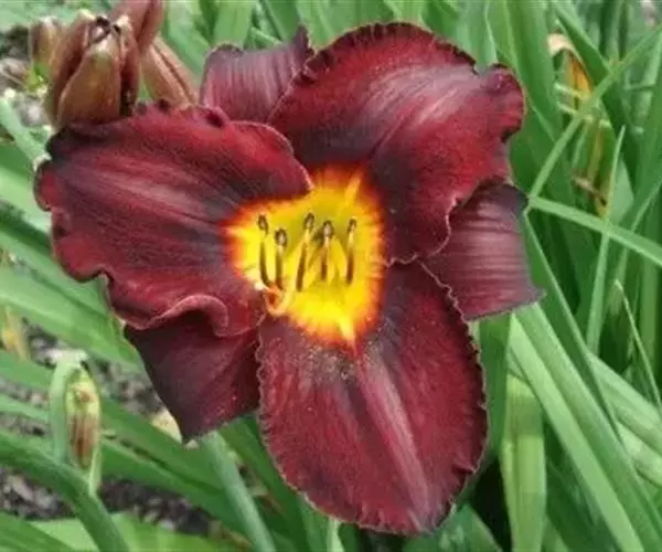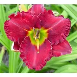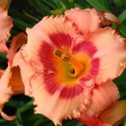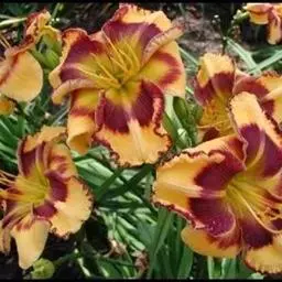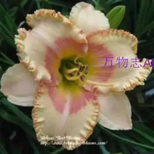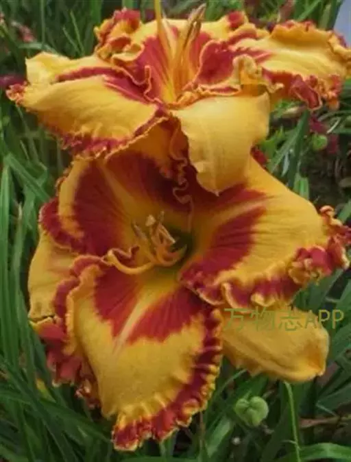 大花萱草(学名:Hemerocallis hybrida Bergmans)是百合科,萱草属多年生宿根草本植物,根状茎粗壮,肉质根。叶基生、宽线形、对排成列,背面有龙骨突起,嫩绿色。花薹由叶丛中抽出,聚伞花序或圆锥花序,有花枝,花色模式有单色、复色和混合色。花大,漏斗形、钟形、星形等,外花被裂片倒披针形或长圆形,内花被裂片倒披针形或卵形,花药黄色、红色、橙色或紫色等多种颜色。子房上位,纺锤形,果实呈嫩绿色,蒴果,背裂,5-10月开花,