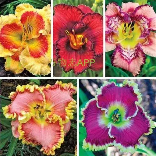 花薹由叶丛中抽出,顶端生聚伞花序或假二歧状圆锥花序,有花枝4-8个,花薹高20-100厘米,每薹着花6-16朵。有红色、黄色、橙色、紫色、绿色、粉色、白色等多种颜色,花色模式有单色、复色和混合色。花大,有漏斗形、钟形、星形等多种花型,花筒长4-10厘米,花冠直径6-14厘米,花瓣6枚,分为内外2层,每层3枚花被片,围绕花柱和花丝呈镊合状排列,外花被裂片倒披针形或长圆形,顶端反卷,边缘无皱缩,长6-10厘米,宽2-6厘米,内花被裂片倒披针形或卵形,顶端反卷,边缘皱缩,长6-10厘米,宽3-9厘米,内外花被片基部合成花被筒。花柱长7-14厘米,柱头表面呈乳突状,成熟时分泌黏液。6枚雄蕊长短不一,花丝长4-10厘米,花药长0.5-1厘米,有黄色、红色、橙色或紫色等多种颜色。子房上位,纺锤形,长0.5-0.9厘米,宽0.3-0.6厘米,绿色。果实呈嫩绿色,果长1.5-3厘米,宽1.5-2.0厘米,蒴果,背裂,内有黑亮种子数粒,自然状态下一些品种可以结实,但大部分品种自然状态下不结实。花期5-10月,