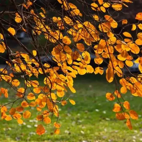 粉背黄栌叶卵圆形,较大,长3.5-10厘米,宽2.5-7.5厘米,无毛,但叶背显著被白粉;叶柄较长,…