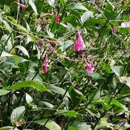 多年生草本或直立灌木,多分枝,茎4棱,明显具沟,绿色,疏被硬毛.叶无柄,卵形,倒卵状披针形,顶端渐尖或尾尖,基部收缩提琴形,下延,圆钝,心形,边缘具锯齿,两面疏被硬毛,上面绿色光亮,具瑰红色侧脉12-15对,嫩叶背面红紫色, 穗状花序腋生,长2-3厘米,花密,苞片长4-8毫米,宽卵形,较花萼短,宿存,小苞片和花萼线形,被腺毛-疏柔毛,花萼不等5裂至中部,裂片线条形,长约7毫米,钝;花冠长3-4厘米,略弯曲,堇色,冠管短而狭,向上逐渐扩大,稍稍一面膨胀,喉部径约2.5厘米.冠檐裂片5,短,具一白色的龙骨瓣,侧裂片宽过于长,外卷;雄蕊4,2强,2长雄蕊能育,花粉超长球形,网状纹饰具隔带状,微扭转(据陈少卿8202,采自广州)。2短雄蕊的花药败育(或空)。花丝极光滑无毛,子房近无毛。