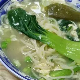 4.将作法3的汤与料加入刀削面碗中,并加入氽烫过的小白菜、酸菜,撒上葱花即可。
