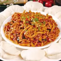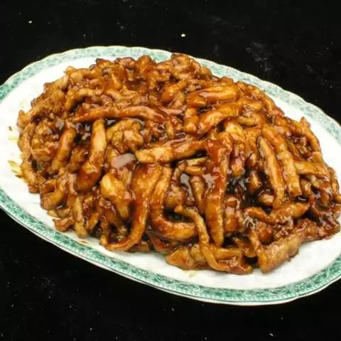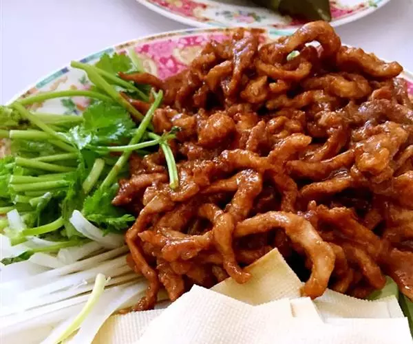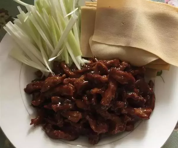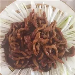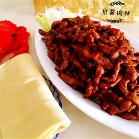 京酱肉丝精选里脊肉为主料,用酱爆烹制而成。食用时辅以葱丝、腐皮,口味咸甜适中,酱香浓郁,风味独特。