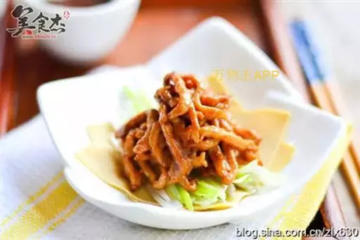 1、将里脊肉切成筷子粗的丝、葱切丝、豆腐皮切5*5CM的大块备用。 京酱肉丝做法图示