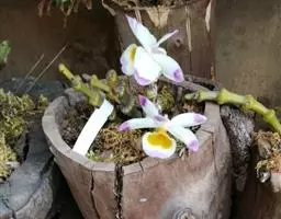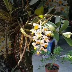 风兰 H.H.Hu):植株高8-10厘米。茎长1-4厘米,稍扁,被叶鞘所包。叶厚革质,狭长圆状镰刀形。…