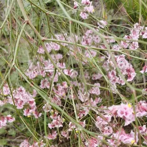 二色补血草(学名:Limonium bicolor (Bag.) Kuntze):白花丹科,补血草属多年生草本植物。高可达60厘米,全体光滑无毛。茎丛生,直立或倾斜。叶多根出;匙形或长倒卵形,基部窄狭成翅柄,近于全缘。花茎直立,多分枝,花序着生于枝端而位于一侧,或近于头状花序;萼筒漏斗状,棱上有毛,白色或淡黄色,宿存;花辩匙形至椭圆形;雄蕊着生于花瓣基部;蒴果5棱,包于萼内。为盐碱地拓荒植物。