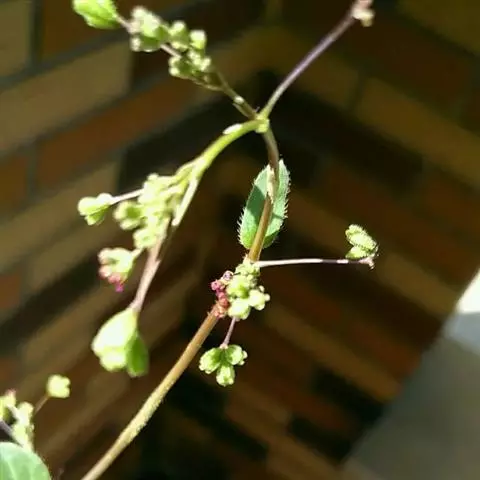 叶子花 藤状灌木。枝、叶密生柔毛;刺腋生、下弯。叶片椭圆形或卵形,基部圆形,有柄。花序腋生或顶生;苞片椭圆状卵形,基部圆形至心形,长2.5-6.5厘米,宽1.5-4厘米,暗红色或淡紫红色;花被管狭筒形,长1.6-2.4厘米,绿色,密被柔毛,顶端5-6裂,裂片开展,黄色,长3.5-5毫米;雄蕊通常8;子房具柄。果实长1-1.5厘米,密生毛。花期冬春间。