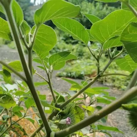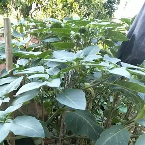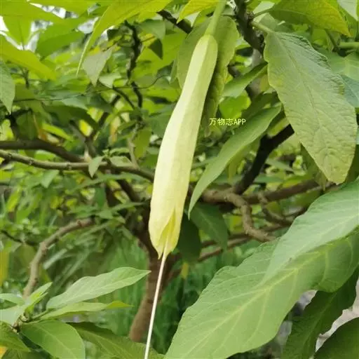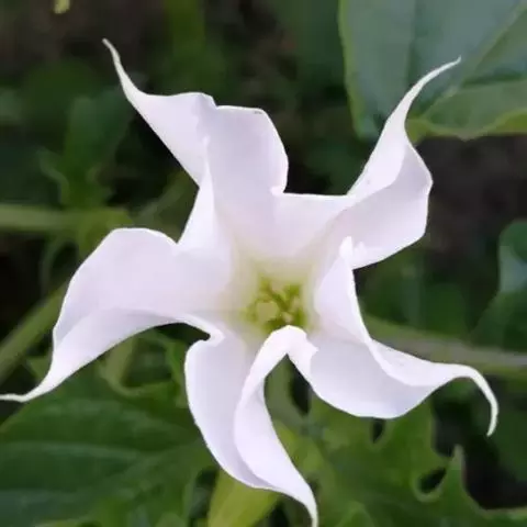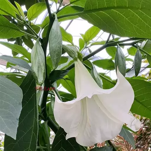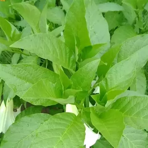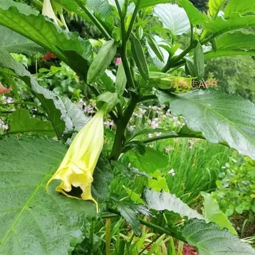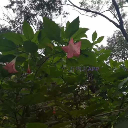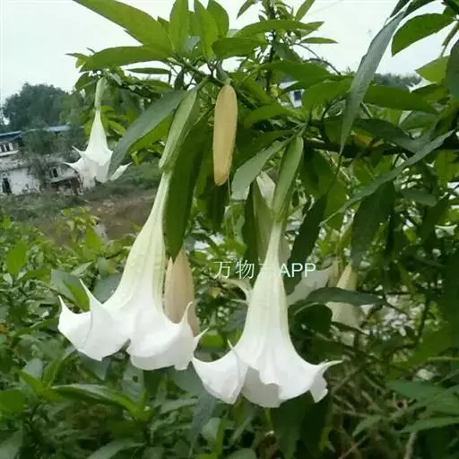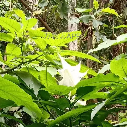 木本曼陀罗,为茄科、曼陀罗属的小乔木,茎粗、叶大,叶卵状心形,顶端渐尖,长15-28厘米,宽8-15厘米,嫩枝和叶两面均要被柔毛,花白色,喇叭状下垂,长达20余厘米,花期6-10月。其洁白硕大的花朵下垂悬吊,犹如灯笼,是种观赏价值很高的花木。