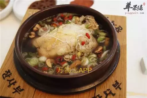 这款汤特别考究,也很耗时,是将特选的6周龄童子鸡,跟韩国进口高丽人参(高丽参与西洋参为世界两大名参)、黄芪、当归、枸杞、大枣、板栗、大蒜、糯米等数十种汉方药材精心炖制而成,具有良好的补气、养颜、安神、抗癌、延寿之功效,清淡鲜美、营养价值极高,四季食用皆宜。此汤尤为韩国运动员所推崇,是韩国第一名汤,特别适合夏天食用。”