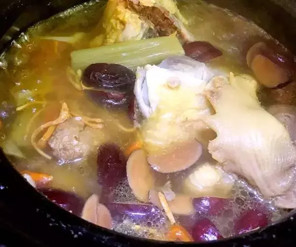 2、加工过的童子鸡放入锅内,加适量水、人参、鹿茸、红枣和调味料,小火炖煮3小时左右。