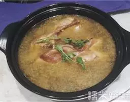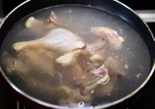 10 在一只合适的锅里,放入充分的水分,先用大火煮一会儿,然后换成小火慢慢地炖,大概炖上40-50分钟左右,汤成白色,肉好像只要轻轻一碰就可以从骨头上掉下来的时候,就可以关火了。炖的程度非常重要,炖的太厉害了,就成粥了,炖得不够肉又会太硬。锅最好用砂锅,没有的话其他的不锈钢锅、铁锅都可以。做好之后的水分应该是刚刚可以没过鸡身,因此开始的时候的水分的调解也很重要。