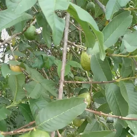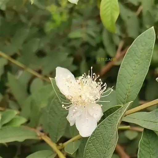 番石榴(Psidium guajava Linn.别名:芭乐,鸡屎果,拔子,喇叭番石榴)桃金娘科乔木,高达13米;树皮平滑,灰色,片状剥落;嫩枝有棱,被毛。叶片革质,长圆形至椭圆形,先端急尖或者钝,基部近圆形,上面稍粗糙,下面有毛,侧脉常下陷,网脉明显;叶柄长5毫米。花单生或者2-3朵排成聚伞花序;萼管钟形,有毛,萼帽不规则裂开;花瓣白色;雄蕊长6-9毫米;子房下位,与萼合生,花柱与雄蕊同长。浆果球形、卵圆形或梨形,顶端有宿存萼片,果肉白色及黄色,胎座肥大,肉质,淡红色;种子多数。