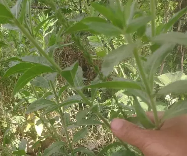 叶草质,对生,茎上部的互生,无柄,并多少抱茎;茎生叶披针状椭圆形至狭倒卵形或椭圆形,稀狭披针形,长4-12(-20)cm,宽0.3-3.5(-5)cm,先端锐尖至渐尖,基部近楔形,边缘每侧具20-50枚细锯齿,两面被长柔毛,有时在背面混生短腺毛,稀背面密被绵毛或近无毛,侧脉常不明显,每侧7-9条。总状花序直立;苞片叶状。