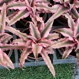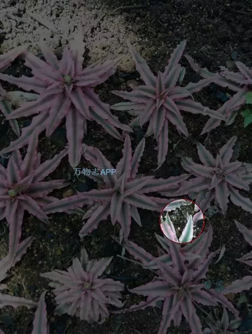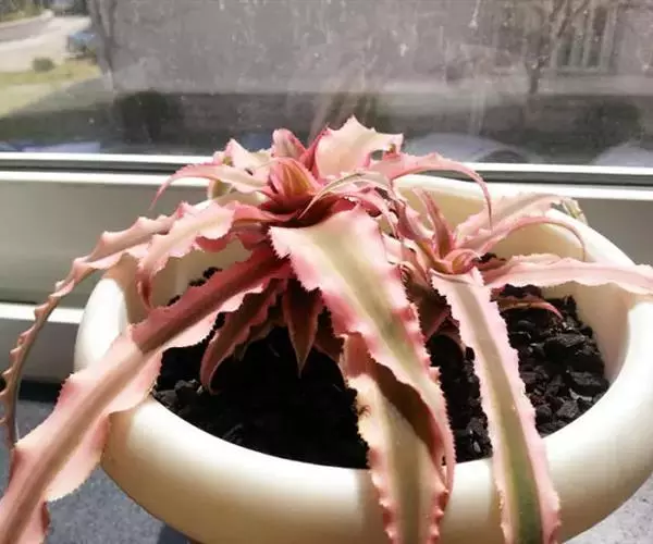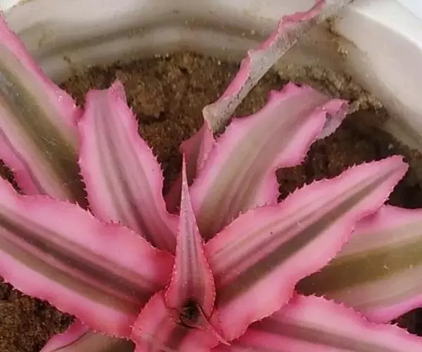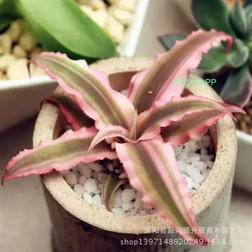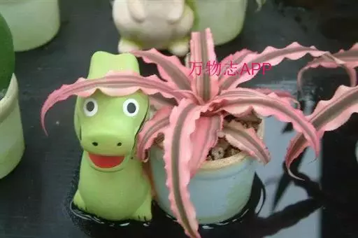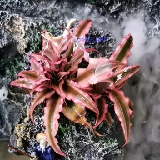 多年生肉质常绿地生性草本植物,植株高约10-50厘米,外轮叶腋具有匍匐茎,叶片从根茎处旋叠状丛生,向上辐射性发生,成为莲座状。叶片质坚硬厚,呈带状尖形或椭圆状披针形,近茎干基部的叶片逐渐缩短,在植株中心互相抱合,形成贮水不漏的杯状叶筒,俗称“水杯”。若把水浇在杯中,基部的鳞毛也能吸收。叶片革质,叶缘大部分呈现波浪状或锯齿形,有的具有短刺。叶色艳丽,形态奇特,背面被白色鳞片,表面有红、黄、绿、褐、紫等多种颜色,有规则地呈现波浪、螺旋斑点等千姿百态的花纹。更具风韵的是,姬风梨的叶脉、花纹随着阳光的强弱而随之变化,叶色时浅时深,花纹时淡时浓。花朵聚集成近似无柄的花序,它隐藏于莲座状的叶丛之中,花头圆锥形、棒形或松散的伞形。经人工授粉,可以结实。