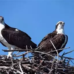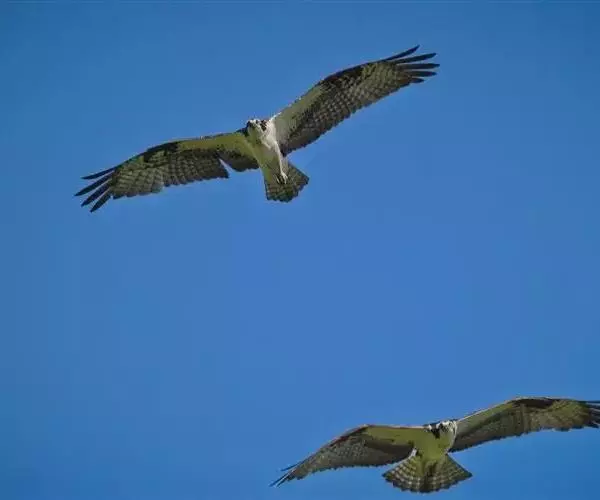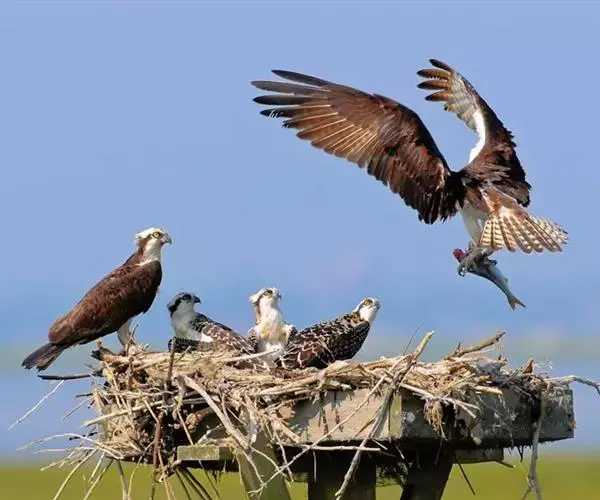 繁殖期在中国南方通常为2-5月,在东北地区大多为5-8月。雄鸟和雌鸟配对以后常常比翼双飞,鸣声不断。鹗的婚飞别具一格,雄鸟首先在空中翱翔,身体呈一个很陡的角度,爪子上紧紧地抓着一条鱼或者一根骨头,一边吃力地飞行,一边摇晃着双脚,有时甚至向后倒着飞行,同时发出一种激昂的叫声。雌鸟则高声地应和着,与雄鸟一起上下翻飞。通常营巢于水边的树冠之上,也在水边的悬崖峭壁和岩石上营巢。在食物丰富的地方,会有很多巢密密麻麻地聚集在一起,据说在一个面积不到1200公顷的区域上就曾发现300多个巢。
