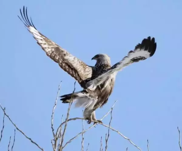 白肩雕:又名御雕,是大型猛禽。体长73-84厘米。体羽黑褐色,头和颈较淡,肩部有明显的白斑,在黑褐…