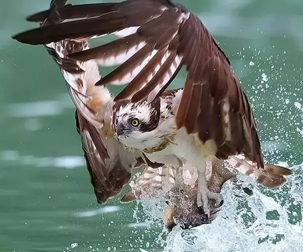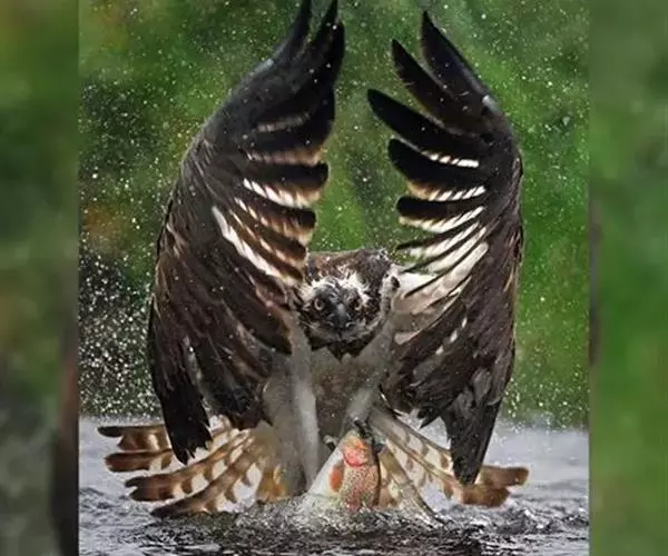 照片中,鹗眼神坚定,飞速朝目标猎物飞去,在飞出水面的一瞬间,它的两只爪各抓住一条鳟鱼,翅膀完全张开,翼展足足有1.8米宽,且十分有力。49岁的俄罗斯业余摄影师伊戈尔已经在此等候有好几个小时,捕捉到这一幕是完全出乎意料的,因为通常情况下鹗要尝试6到7次才可能成功捕捉到猎物,像这样一次出动就捕到两只猎物的情况十分罕见,而且鹗的速度非常快,就使得拍摄更加困难。