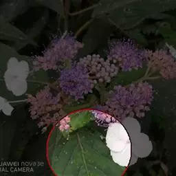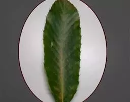 叶片长倒卵形至椭圆形,长6-20厘米,宽3-8厘米,顶端圆钝,基部为不甚平整的耳形,叶缘有4-7对深浅不等的圆钝锯齿,叶面淡绿色,叶背粉绿色,侧脉每边6-9条;叶柄长3-5毫米。