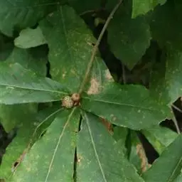 夏栎 落叶乔木,树高可达40米。幼枝被毛,不久即脱落;小枝赭色,无毛,被灰色长圆形皮孔;冬芽卵形,芽鳞多数,紫红色,无毛。