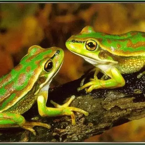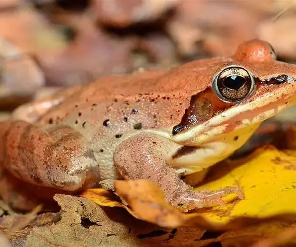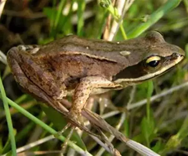 中国林蛙(学名:Rana chensinensis):雌蛙体长44~53毫米,雄蛙较小;头较扁平,头长宽相等或略宽;吻端钝圆,略突出于 下颌,吻棱较明显;鼻孔位于吻眼之间,鼻间距大于眼间距而与上眼睑宽。背侧褶在鼓膜上方呈曲折状;后肢长为体长的185%左右,后肢前伸贴体时胫跗关节超过眼或鼻孔;外侧3趾间几乎近2/3蹼;鼓膜部位有三角形黑斑。雄蛙第一指基部的两个大婚垫内下侧间的间距明显,近腕部一团不大于指部一团;有一对咽侧下内声囊。