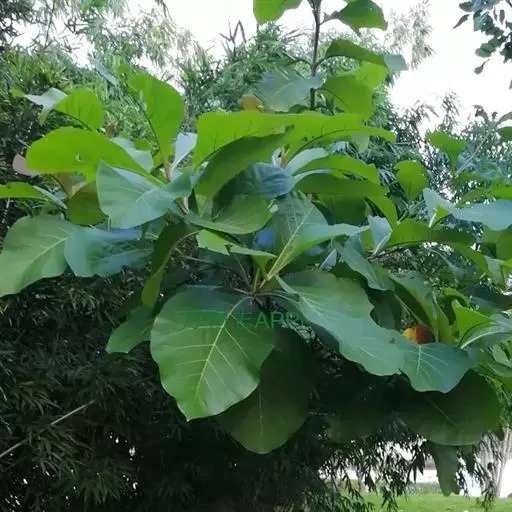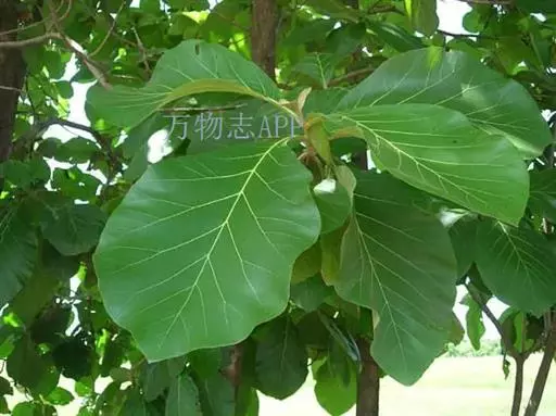 叶对生,厚纸质,全缘,卵状椭圆形或倒卵形,长15-45(-70)厘米,宽8-23-(37)厘米,顶端钝圆或渐尖,基部楔形下延,表面粗糙,有白色突起,沿脉有微毛,背面密被灰褐色至黄褐色星状毛;侧脉7-12对,第三回脉近平行,在背面显著隆起;叶柄粗壮,长2-4厘米。
