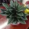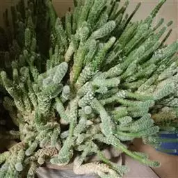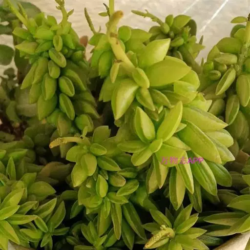 厘米,先端尖、基部棒糙形,一侧中间圆弧形突出,另一侧平直,弧形一侧的边缘较薄,有透明的条纹,平直的一侧边缘厚,整个叶就像一把斧子。带粉的灰绿色。花序很长,花黄绿色。
