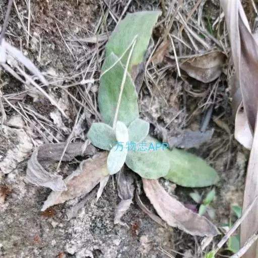 基生叶数个,莲座状,具短柄,在花期生存,长圆形或卵状长圆形,长5-10厘米,宽1.5-2.5厘米,顶端钝,具小尖,基部楔状至渐狭成具狭至宽翅叶柄,两面被密或疏白色蛛丝状绒毛;茎叶少数,向茎上部渐小,下部叶倒披针形,或倒披针状长圆形,长4-8厘米,宽0.5-1.5厘米,钝至尖,无柄,基部半抱茎,上部叶小,披针形,苞片状,顶端尖。