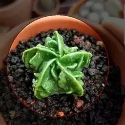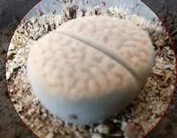 荒玉为番杏科生石花属,原产南非。株体呈白粉色,表面布满凹凸纹路,凹陷处为红褐色,每年秋季开黄花。
