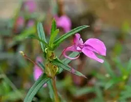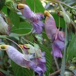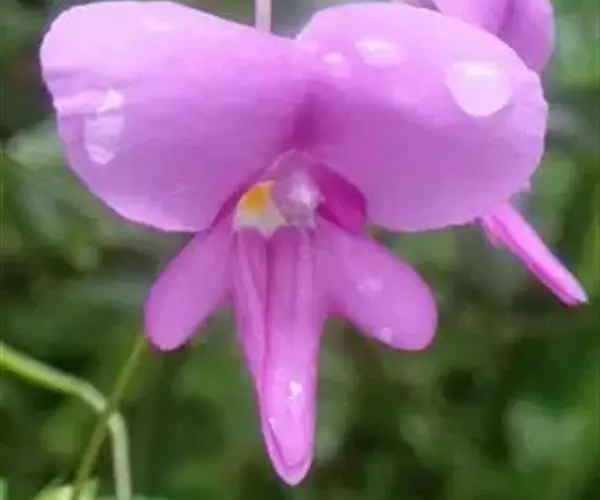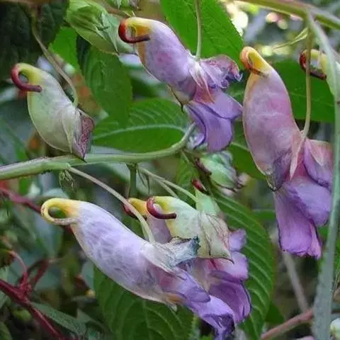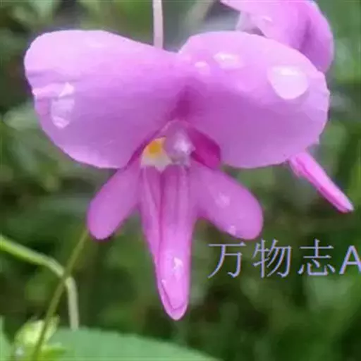 总花梗单生于上部叶腋,长4-7厘米,具2,稀单花;花梗细,长1.5-3厘米,上部具苞片;苞片披针形,长5-7毫米,顶端渐尖,宿存。花紫色,长3.5-4.5厘米,侧生萼片2,绿色,宽卵形,长5-6毫米,宽3-4毫米,顶端长突尖,边缘具细齿。旗瓣大,扁圆形或肾形,长16毫米,宽35毫米,顶端凹入,背面中肋具窄龙骨状突起,先端具小尖头;翼瓣无柄,长26毫米,2裂,基部裂片长圆形,顶端圆形,上部裂片斧形,具三角状浅裂,背部具不明显的小耳;唇瓣窄漏斗形,长4-4.5厘米,口部斜上,长15毫米,先端具喙尖,基部渐狭成长2-2.5厘米内弯的细距。花丝线形,长5毫米;花药顶端钝。子房纺锤状,直立,长5-6毫米,顶端具5-6小齿裂。蒴果长圆形,长1.8-2厘米,顶端具3-5齿裂。种子多数,球形,长3毫米,褐色,光滑。花期9-10月。