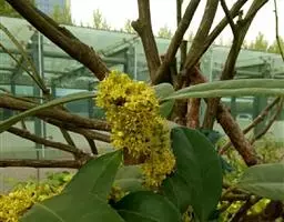 花序簇生于二年生枝的叶腋内,基部宿存鳞片近圆形,被柔毛,具缘毛;苞片卵形,先端钝或具短尖头,被短柔毛和缘毛;花淡黄色,4基数。雄花;花梗长5~6毫米,无毛,基部具1~2枚阔三角形的小苞片;花萼盘状;直径约2.5毫米,裂片膜质,阔三角形,长约0.7毫米,宽约1.5毫米,疏被微柔毛,具缘毛;花冠辐状,直径约7毫米,花瓣长圆状卵形,长3~4毫米,反折,基部合生;雄蕊与花瓣近等长或稍长,花药长圆状卵形,长约1毫米;退化子房近球形,先端钝或圆形,不明显的4裂。