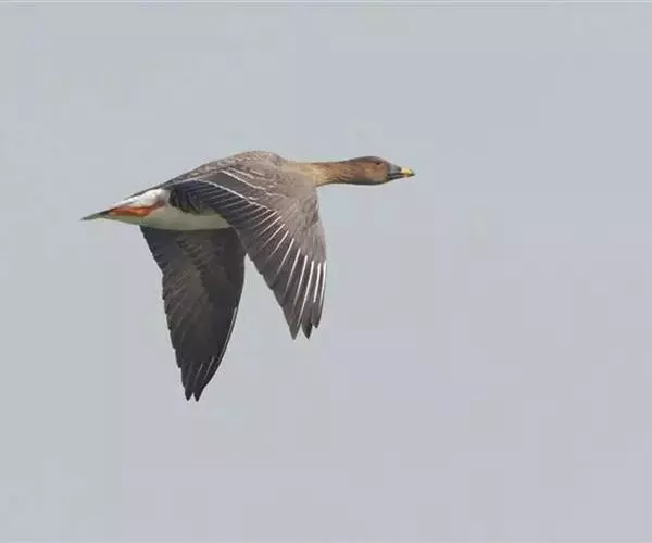 豆雁,雁形目鸭科。成鸟头、颈、背灰褐色,带淡黄色羽缘;尾上覆羽白色,尾羽黑褐色带白端,…