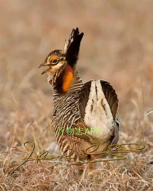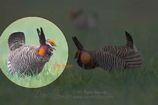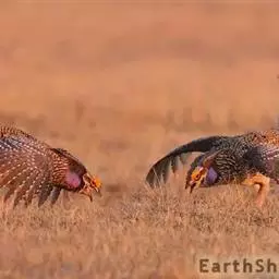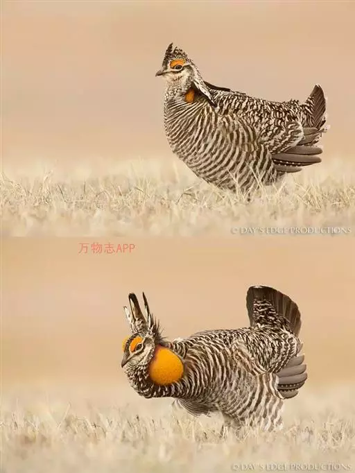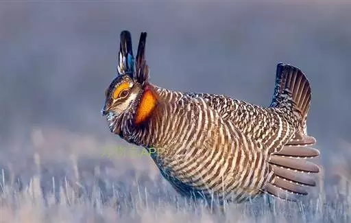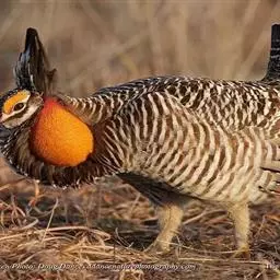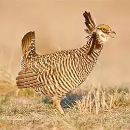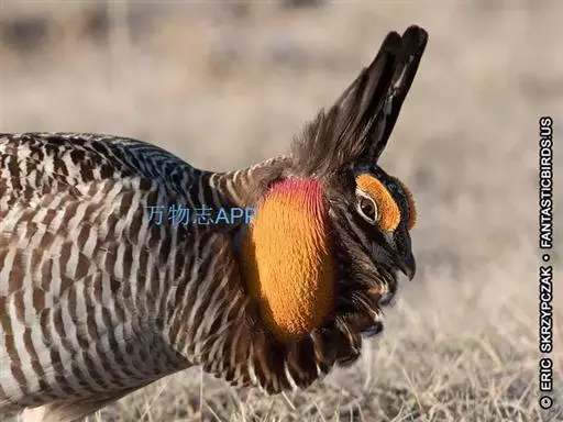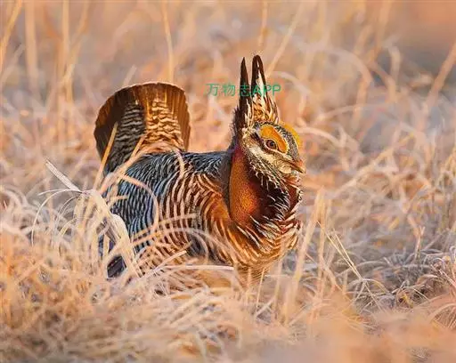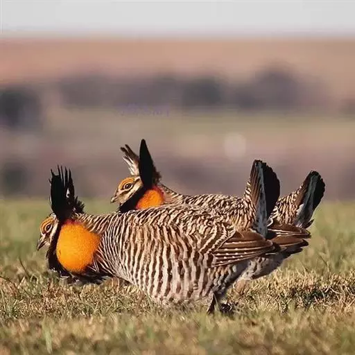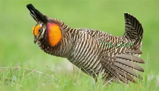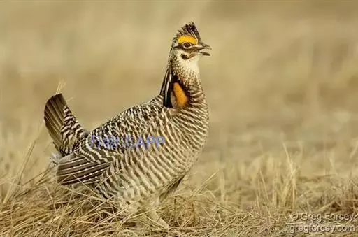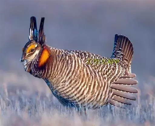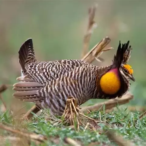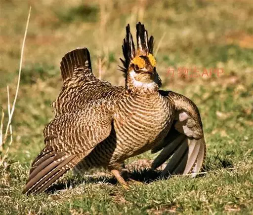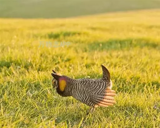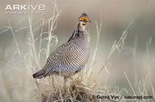 草原松鸡(学名:Tympanuchus cupido):体长43-47厘米,翼展69厘米,体重900-1100克。雄鸟头顶耸立的针状羽毛形成的两个尖顶羽冠。颈部和眼睛上方有黄橙色的膨胀的大气囊。雌鸟的上体是锈褐色,夹杂着黑色及皮黄色的的横斑,下体较淡。在交配季节,雄鸟会发出一个800米远都能听到的鸣叫声,胸部的气囊也会放大。虹膜褐色,嘴角黄色或白色,跗蹠被羽到趾。