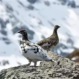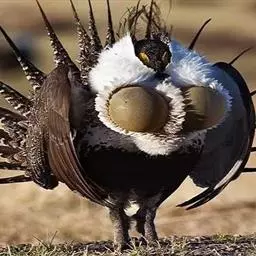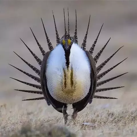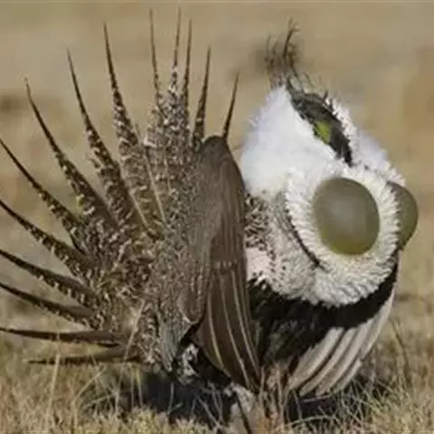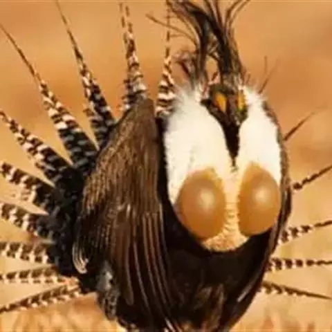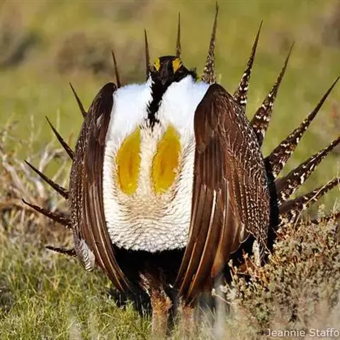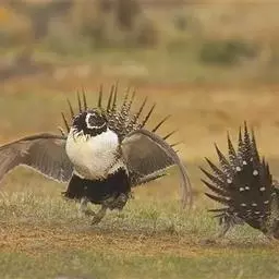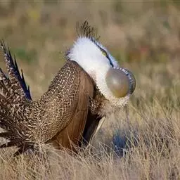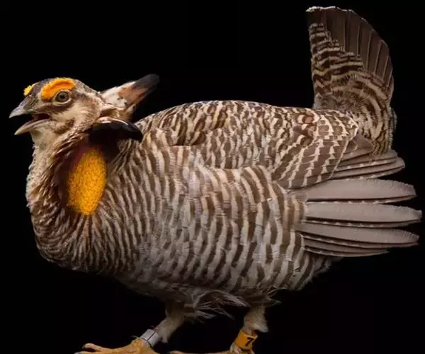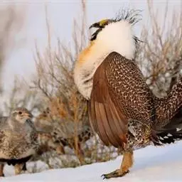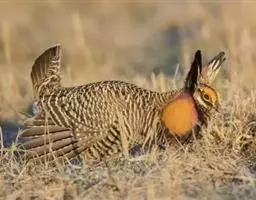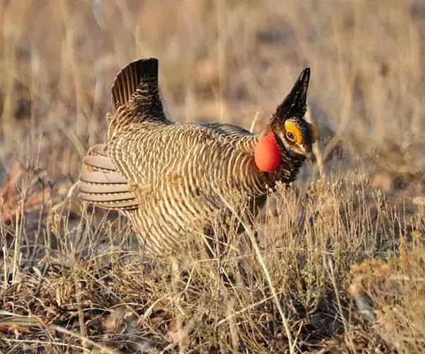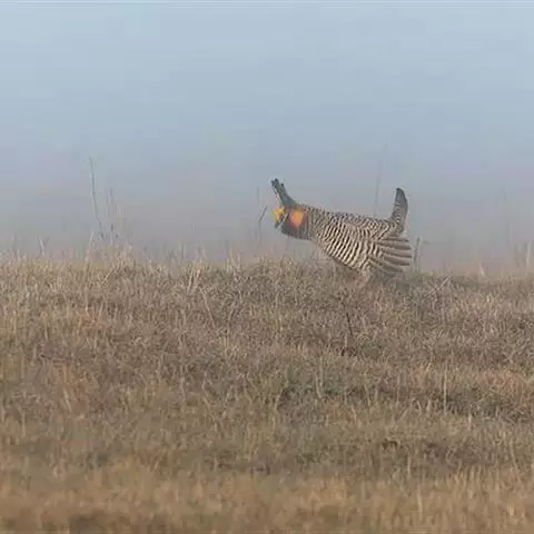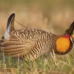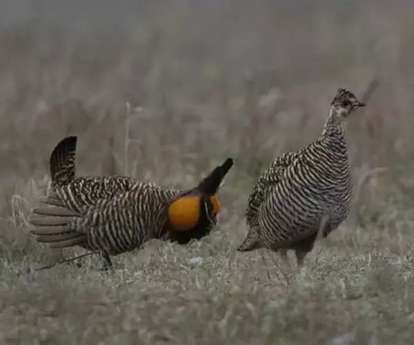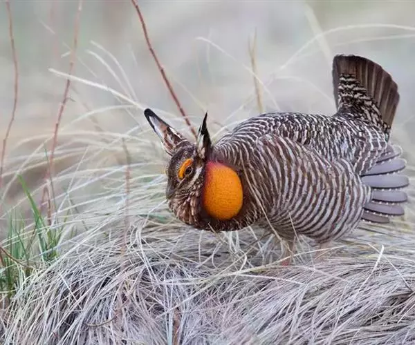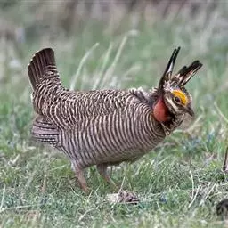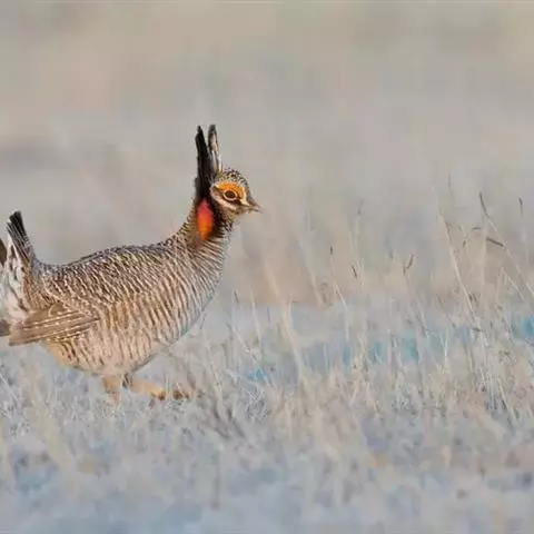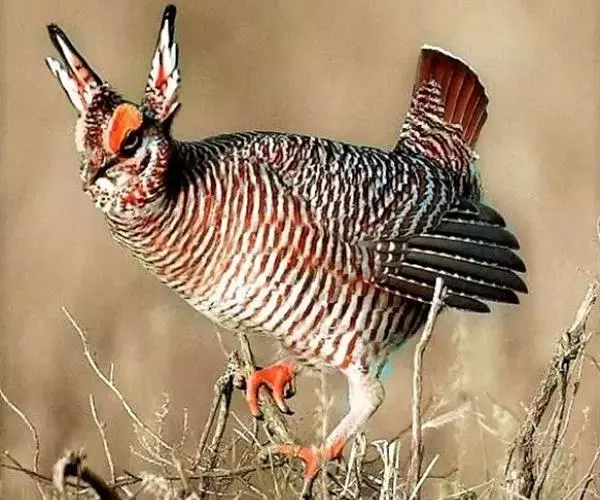 草原松鸡(学名:Tympanuchus cupido):体长43-47厘米,翼展69厘米,体重900-1100克。雄鸟头顶耸立的针状羽毛形成的两个尖顶羽冠。颈部和眼睛上方有黄橙色的膨胀的大气囊。雌鸟的上体是锈褐色,夹杂着黑色及皮黄色的的横斑,下体较淡。在交配季节,雄鸟会发出一个800米远都能听到的鸣叫声,胸部的气囊也会放大。虹膜褐色,嘴角黄色或白色,跗蹠被羽到趾。
