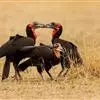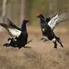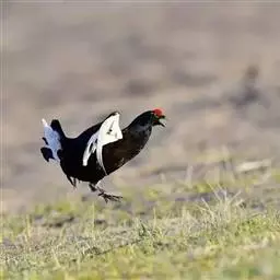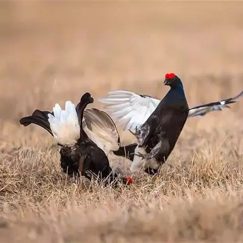 草原松鸡举行这种奇特的比舞炫耀。开始之前,雄松鸡作短程跑步,接着就表演快节拍的踢跶舞,发出打鼓一般的声音。它竖尾展羽,同时鼓起头部两侧色彩鲜艳的气囊。松鸡发出奇怪而宏亮的轰隆轰隆声,于是气囊逐渐萎缩,接着发出的声音却和农庄的鸡啼一样。它同时上跃,一落地就追逐任何靠近的雄鸟。两只雄鸟于是交斗一番,用翅膀互相击打。