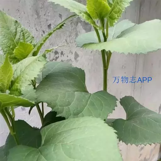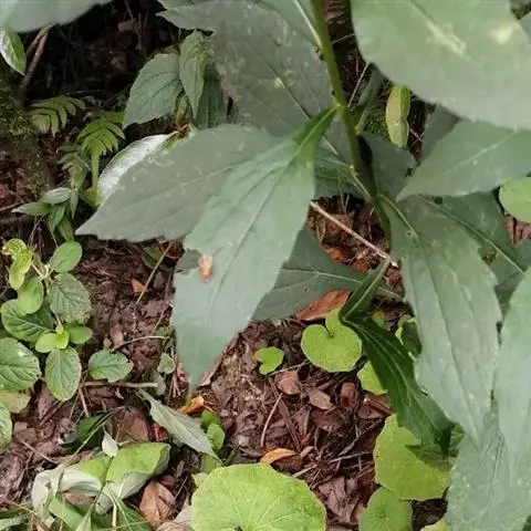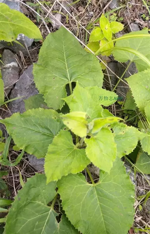 根状茎粗壮。茎直立,高100-150厘米,上部有斜升的分枝,被微毛。基部叶在花期枯萎,叶片心形,长9-15厘米,宽6-15厘米,边缘有具小尖头的齿,顶端尖,基部急狭成长约10-15厘米被微毛的柄;中部叶较小,卵状三角形,基部圆形或稍截形,有具翅的短柄;上部叶小,矩圆披针形或条形;全部叶两面被微糙毛,下面浅色,有三或五出脉,网脉显明。