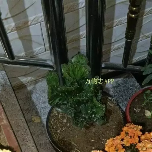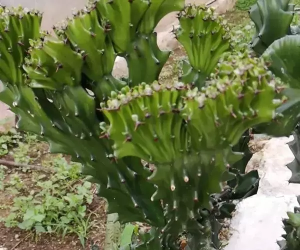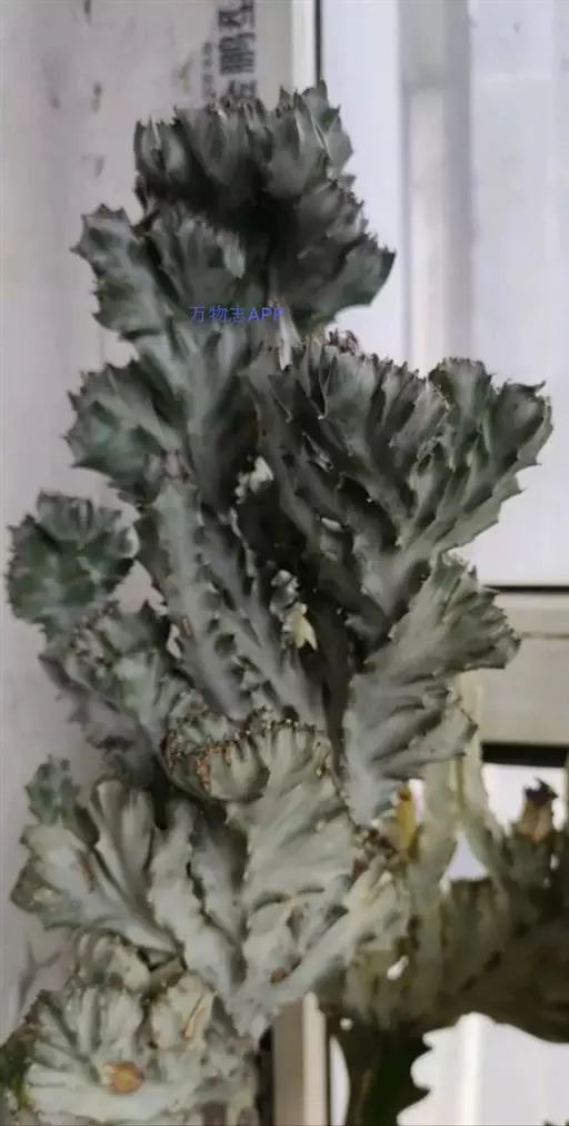 具棱的肉质茎变态成鸡冠状或扁平扇形,其他同霸王鞭。全株含有白色剧毒乳汁,误食可造成严重中毒;溅入眼中可致失明。
