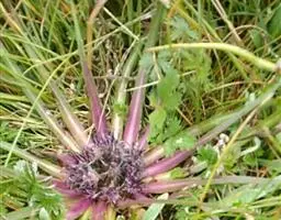 茎粗壮,基部残存密集棕褐色叶片;头状花序顶生,总苞片卵形叶状,近似膜质,呈白色或淡绿黄色;花棕紫色,全为管状花;瘦果刺毛状。