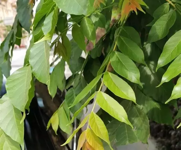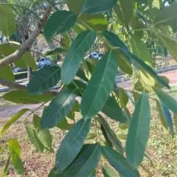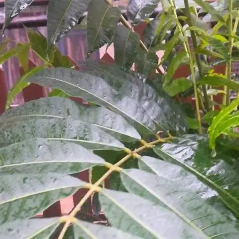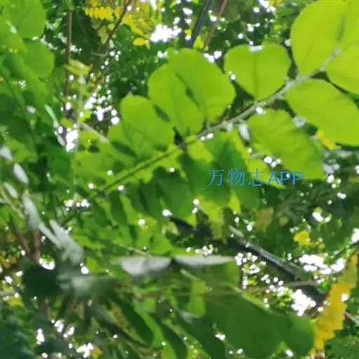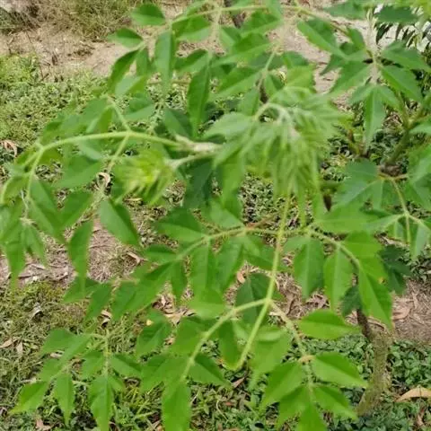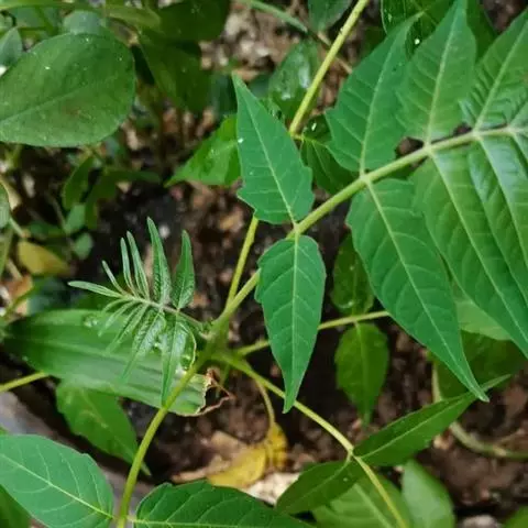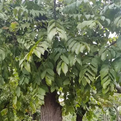 叶通常为偶数羽状复叶,长30-50厘米,无毛,小叶10-16枚;叶柄圆形柱形,长4.5-7厘米;小叶互生,纸质,卵形至长圆状披针形,长7-12厘米,宽3-5厘米,先端渐尖,基部圆形,偏形,偏斜,下侧常短于上侧,两面均无毛或近无毛,侧脉每边10-15条,至边缘处分叉,背面侧脉稍明显突起;小叶柄长4-8毫米。