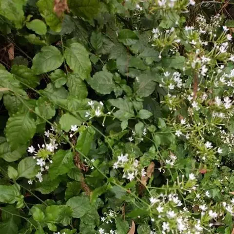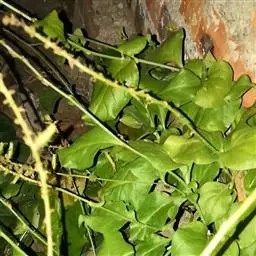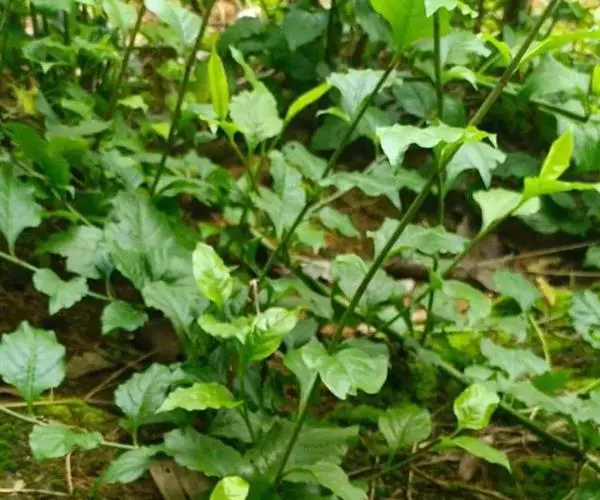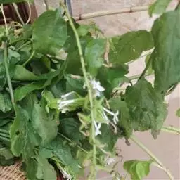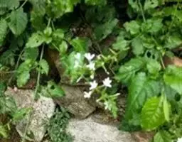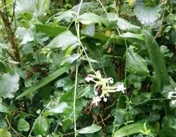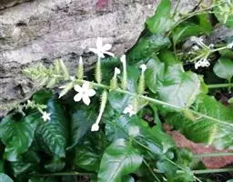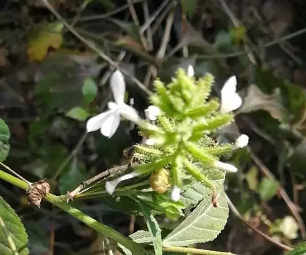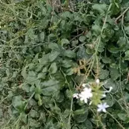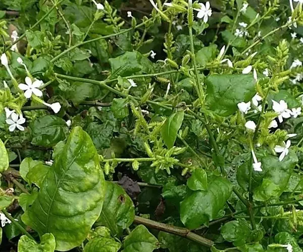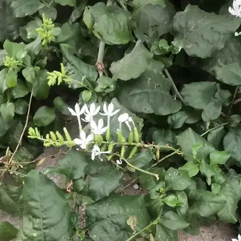 白花丹,多年生蔓生亚灌木状草本,高2-3m。茎细弱,基部木质,多分枝,有细棱,节上带红色,除具腺外,光滑无毛。单叶互生;叶柄基部扩大而抱茎;叶片纸质,卵圆形至卵状椭圆形,长4-10cm,宽1.5-5cm,先端尖,基部阔楔形,无毛,全缘。