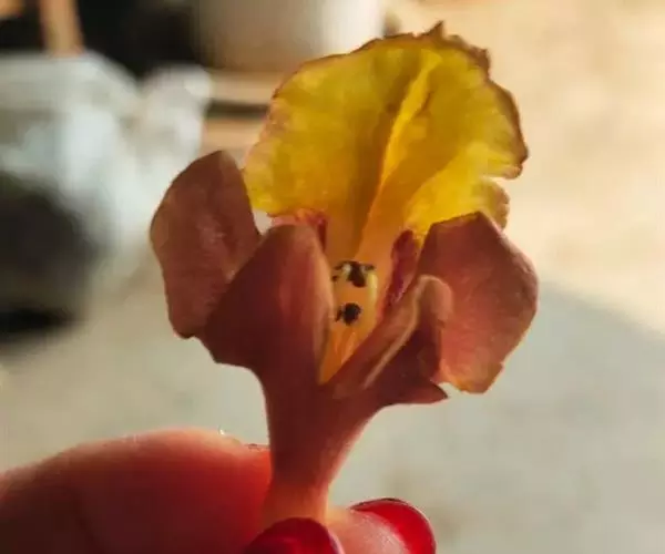 云南石梓 落叶乔木,高达15米,胸径30-50厘米,树干直;树皮灰棕色,呈不规则块状脱落;幼枝、叶柄、叶背及花序均密被黄褐色绒毛;幼枝方形略扁,有棱,老后渐圆,具皮孔,叶痕明显突起。叶片厚纸质,广卵形,长8-19厘米,宽4.5-15厘米,顶端渐尖,基部浅心形至阔楔形,近基部有2至数个黑色盘状腺点,基生脉三出,侧脉3-5对,第3回侧脉近平行,在背面显著隆起;叶柄圆柱形,长3.5-10厘米,有纵沟。聚伞花序组成顶生的圆锥花序,总花梗长15-30厘米;花萼钟状,长约3-5毫米,外面有黑色盘状腺点,顶端有5个三角形小齿;花冠长3-4厘米,黄色,外面密被黄褐色绒毛,内面无毛,两面均疏生腺点,二唇形,上唇全缘或2浅裂,下唇3裂,中裂片长而大,裂片顶端钝圆;雄蕊4,二强,长雄蕊及花柱略伸出花冠喉部;子房无毛,具腺点;花柱疏生腺点,柱头不等长2裂。核果椭圆形或倒卵状椭圆形,长1.5-2厘米,成熟时黄色,干后黑色,常仅有1颗种子。花期4-5月,果期5-7月。