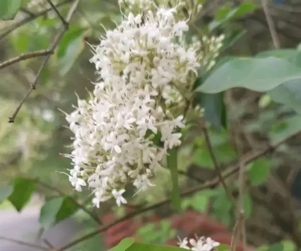 花:圆锥花序顶生或腋生,塔形,长4-11厘米,宽3-8厘米;花序轴被较密淡黄色短柔毛或柔毛以至近无毛;花梗长1-3毫米,被短柔毛或无毛;花萼无毛,长1-1.5毫米,先端呈截形或呈浅波状齿;花冠长3.5-5.5毫米,花冠管长1.5-2.5毫米,裂片长圆状椭圆形或卵状椭圆形,长2-4毫米;花丝与裂片近等长或长于裂片,花药长圆形,长约1毫米。